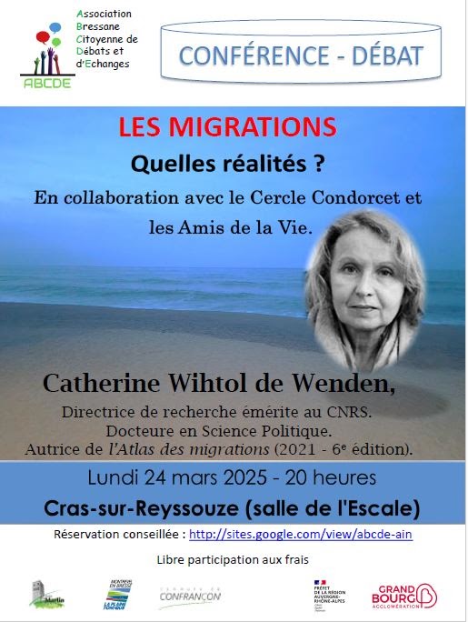 Lundi 24 mars 20h Cras-sur-Reyssouze à l'Escale, conférence-débat « Les migrations : Quelles réalités ? » animée par Catherine Wihtol de Wenden. Organisée par le Cercle Condorcet, les Amis de la Vie et ABCDE, En savoir plus… Inscription recommandée sur ce même site.