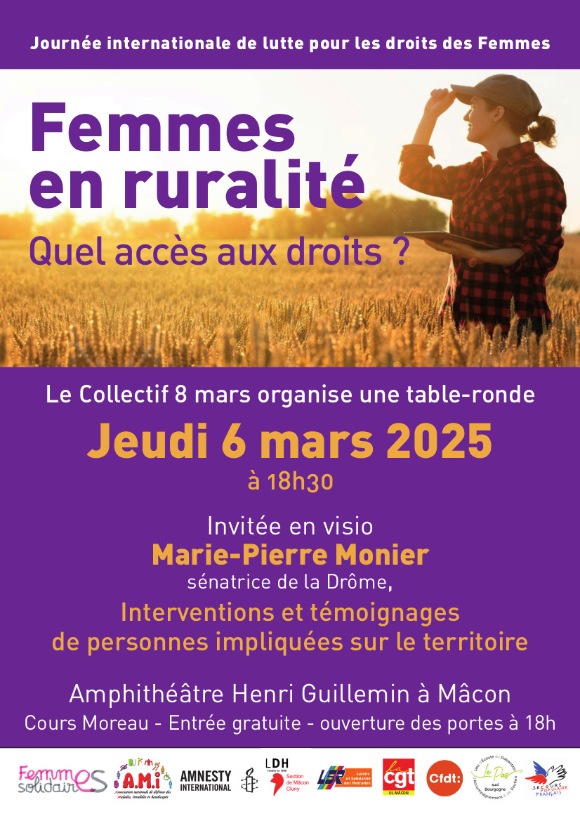 Jeudi 6 mars 18h30 Mâcon, amphithéâtre Guillemin, cours Moreau "les femmes en ruralité: quel accès aux droits ?" Table ronde organisé par Collectif 8 mars (Femmes Solidaires, LDH, CGT etc..) L’affiche-Annonce