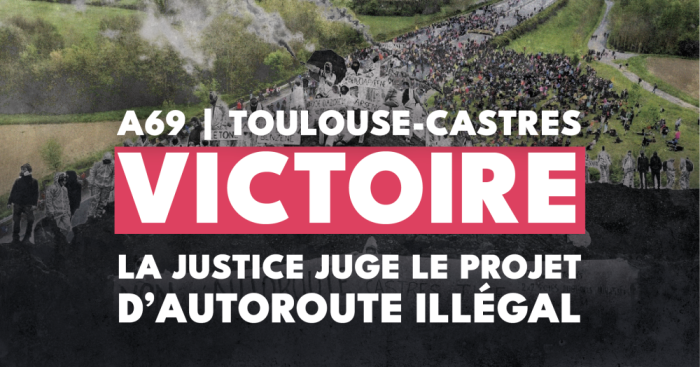| | Attac France et son comité local Attac Tarn applaudissent la décision des juges du TA de Toulouse qui annule ce jour la Raison Impérative d’Intérêt Public Majeur (RIIPM) de l’A69 au motif que cette autoroute est inutile, injuste, écocide et climaticide. |