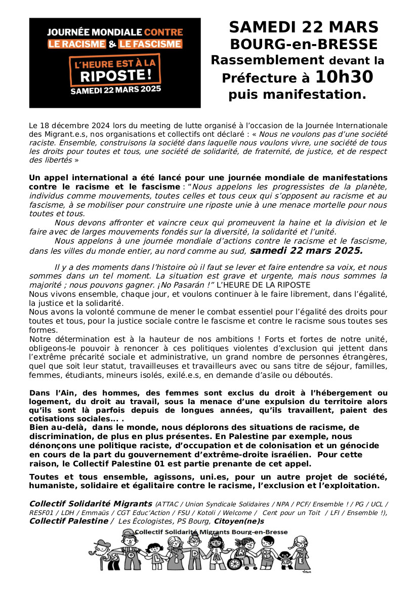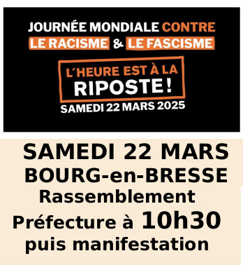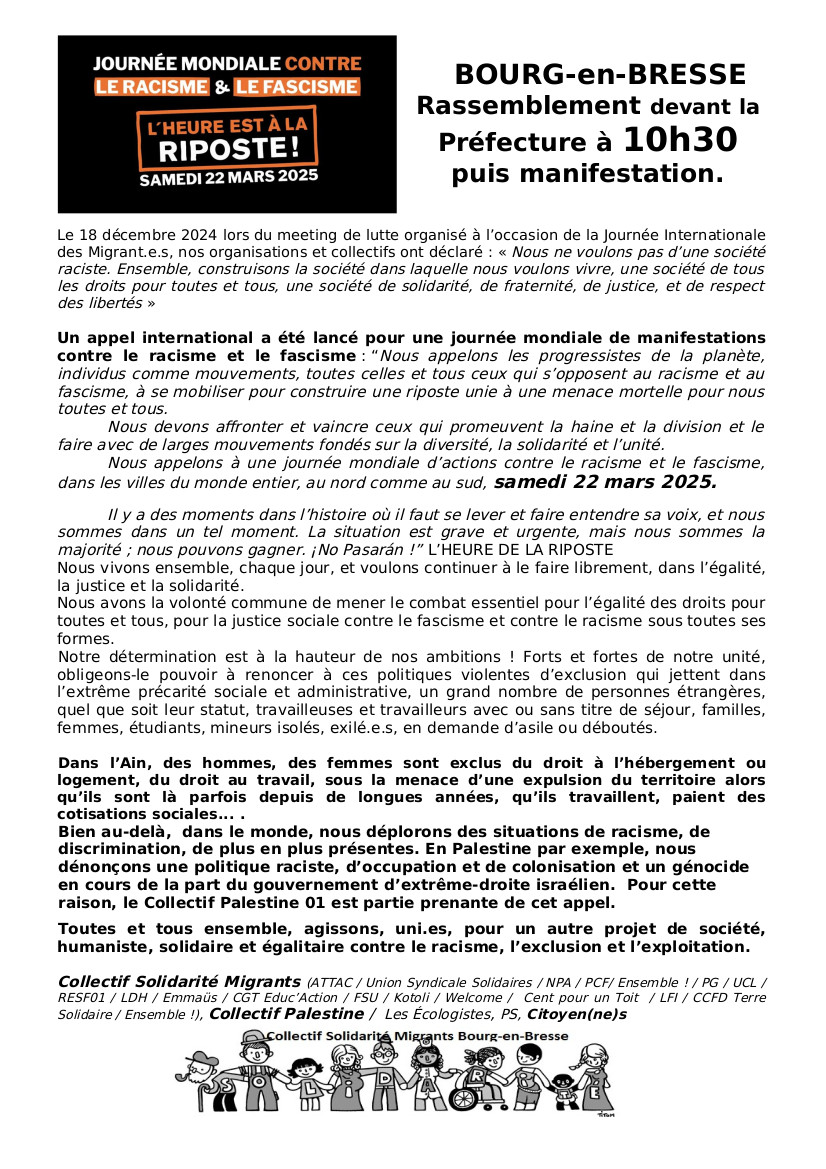 Samedi 22 mars 2025 10h30 Bourg-en-Bresse. Préfecture. Journée internationale contre le racisme et le fascisme. Manifestation unique à l’appel du collectif Solidarité Migrants, du Collectif Palestine et d’autres organisations contre tous les racismes, apartheid, génocide. Départ Préfecture