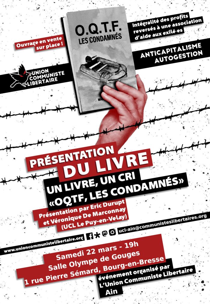 Samedi 22 mars 19h Bourg-en-Bresse, salle Olympe de Gouges, 1 rue Pierre Sémard. Présentation du livre « OQTF les condamnés » par Eric Durupt et Véronique De Marsonnay. Proposé par l’UCL Union Communiste Libertaire ucl-ain@communisteslibertaires.org. L’affiche-Annonce