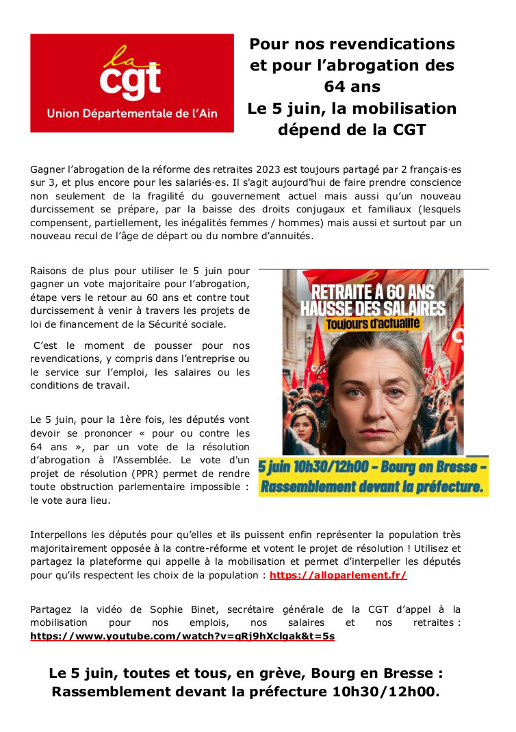 Jeudi 5 juin « en grève et en manifestations pour nos retraites, nos emplois et nos salaires »