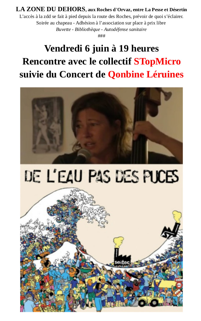 Vendredi 6 juin 19h Aux Roches d’Orvaz à la ZDD Zone du Dehors Rencontre avec le collectif StopMicro suivie du Concert de Qonbine Léruines La soirée du 6 juin commencera par une réunion publique du collectif grenoblois STopMicro, qui s’oppose à la numérisation de nos vies. Elle se poursuivra par les chansons anarcha-féministes de Qonbine Léruines. L’affiche En savoir plus
