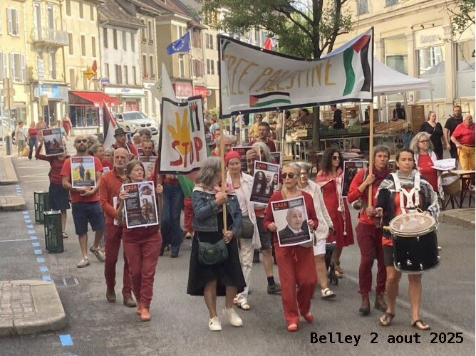 | A BELLEY, OYONNAX et aussi Bourg-en-Bresse et Bellegarde Avec le Collectif National pour une Paix Juste et Durable entre Palestiniens et Israéliens, nous appelons à se mobiliser pour exiger : • La réouverture immédiate et massive à l’aide humanitaire à Gaza sous le contrôle de l’ONU et des ONG internationales, et l’accès de Gaza aux soignants et journalistes internationaux. • La conclusion d’un cessez-le-feu immédiat et durable à Gaza, l’arrêt immédiat des bombardements et le retrait des troupes terrestres israéliennes, la libération de toutes les personnes détenues. • L’arrêt par la France de toute coopération militaire et de toute livraison d’armes, de munitions et d’équipements militaires à Israël, et l’interdiction de leur transit sur son territoire. • Que la France engage des sanctions contre Israël, sur le plan diplomatique et par la rupture des coopérations commerciales, universitaires et de recherche avec Israël, susceptibles de contribuer aux violations des droits humains. • La suspension de l’Accord d’Association entre l’Union européenne et Israël. |