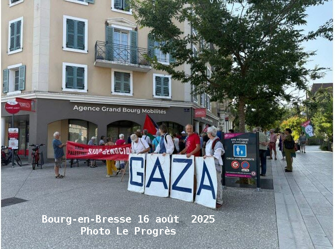 | | Samedi 23 août 10h30 Bourg-en-Bresse - rue du 19 mars 1962 (entre Rubis et le Beau Marché) Rassemblement de soutien au peuple palestinien.