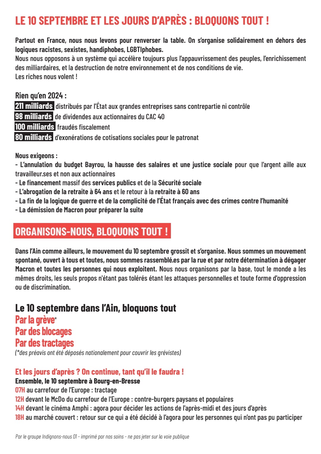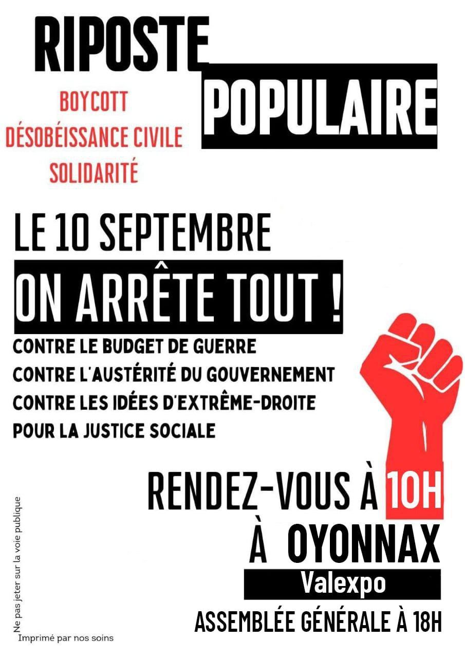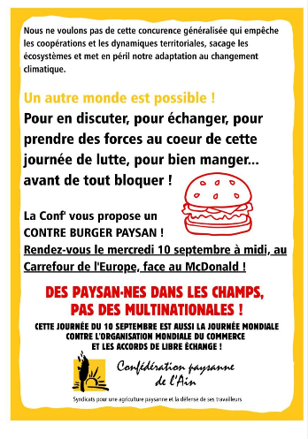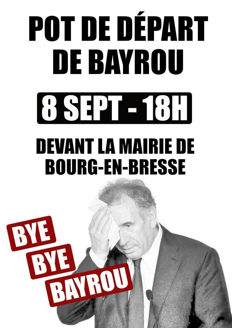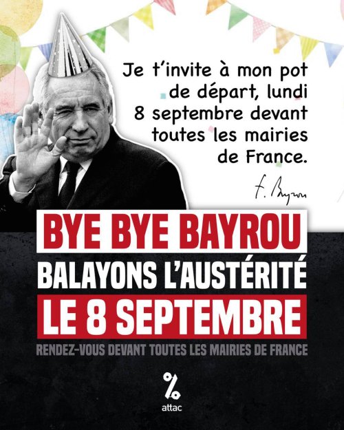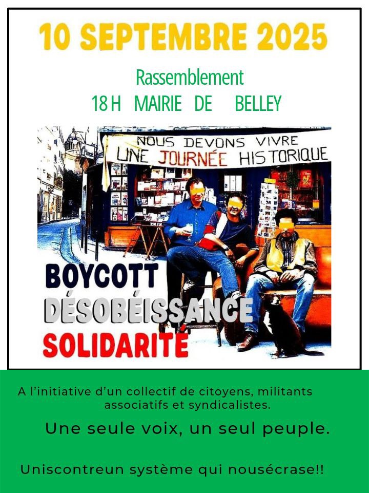 Autour du 10 septembre Note préalable : le mouvement BLOQUONS TOUT étant un mouvement citoyen horizontal et non vertical, les informations peuvent être fluctuantes et non définitives (ATTAC ne mentionne ici que les rassemblements grand public ; pour les rencontres de préparation ou de travail, consultez vos réseaux sociaux habituels dont la boucle Telegram-Ain -lien en cliquant sur ce lien) Lundi 8 septembre 18h Bourg-en-Bresse, place de l’hôtel de Ville . Apéro-Rassemblement festif pour fêter le départ de Bayrou après la motion de censure. Un appel national pour un rassemblement devant toutes les mairies a été lancé. Mercredi 10 septembre 12h Bourg-en-Bresse opération Contre Burger Paysan, carrefour de l’Europe (en face du Mac Do) action initiée par la Conf Paysanne) Mercredi 10 septembre 14h Bourg-en-Bresse. Rassemblement Champ de foire coté Amphi. Mercredi 10 septembre Journée Hautevile Déploiements et tractage (infos sur le site CGT Educ’Action) Mercredi 10 septembre après-midi Nantua Déploiements et tractage (infos sur le site CGT Educ’Action)