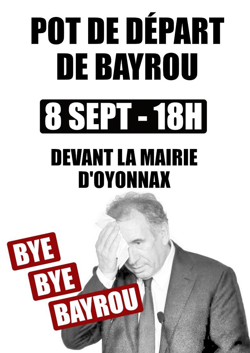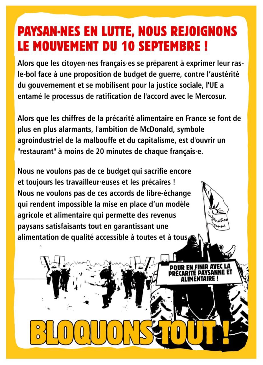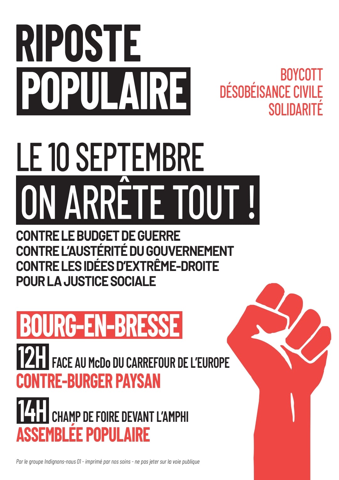 Autour du 10 septembre Note préalable : le mouvement BLOQUONS TOUT étant un mouvement citoyen horizontal et non vertical, les informations peuvent être fluctuantes et non définitives (ATTAC ne mentionne ici que les rassemblements grand public ; pour les rencontres de préparation ou de travail, consultez vos réseaux sociaux habituels dont la boucle Telegram-Ain -lien en cliquant sur ce lien) Lundi 8 septembre 18h Bourg-en-Bresse, place de l’hôtel de Ville . Apéro-Rassemblement festif pour fêter le départ de Bayrou après la motion de censure. Un appel national pour un rassemblement devant toutes les mairies a été lancé. Mercredi 10 septembre 12h Bourg-en-Bresse opération Contre Burger Paysan, carrefour de l’Europe (en face du Mac Do) action initiée par la Conf Paysanne) Mercredi 10 septembre 14h Bourg-en-Bresse. Rassemblement Champ de foire coté Amphi. Mercredi 10 septembre Journée Hautevile Déploiements et tractage (infos sur le site CGT Educ’Action) Mercredi 10 septembre après-midi Nantua Déploiements et tractage (infos sur le site CGT Educ’Action)
