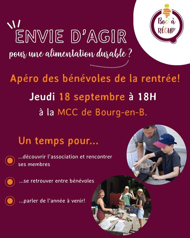 Un pas vers l'écomobilité – septembre 2025 : Bougeons futé A lire sur le site AutosBus . Pour vous inscrire directement à la lettre : contact@autosbus.fr Boc' à RECUP' est une association qui agit pour une alimentation et une agriculture durable. Basé à Bourg-en-Bresse (MCC) l’association a des actions sur tout le département de l'Ain. Le jeudi 18 septembre à partir de 18h à Bourg-en-Bresse à la MCC elle organise un apéro des bénévoles. Vous n'êtes encore jamais venu·es : vous êtes les bienvenu·es ! Ce sera l'occasion de présenter l'association et les projets en cours et à venir. 🥂 En savoir plus... CSM 01 Collectif Solidarité Migrants 01 se réunit régulièrement le lundi Bourg-en-Bresse, salle du restaurant La Canaille, 1 rue Pierre Sémard. La prochaine réunion sera le lundi 22 septembre 18h, Un apéro festif aura lieu le vendredi 26 septembre de 17h30 à 19h30 à Bourg-en-Bresse au 17 rue du Pont des Chèvres, organisé par les résidents et le Collectif Solidarité Migrants