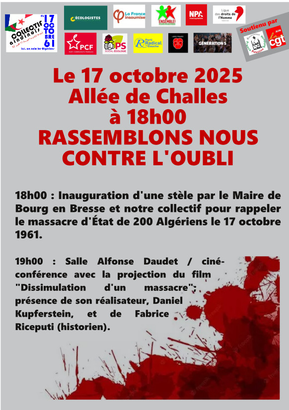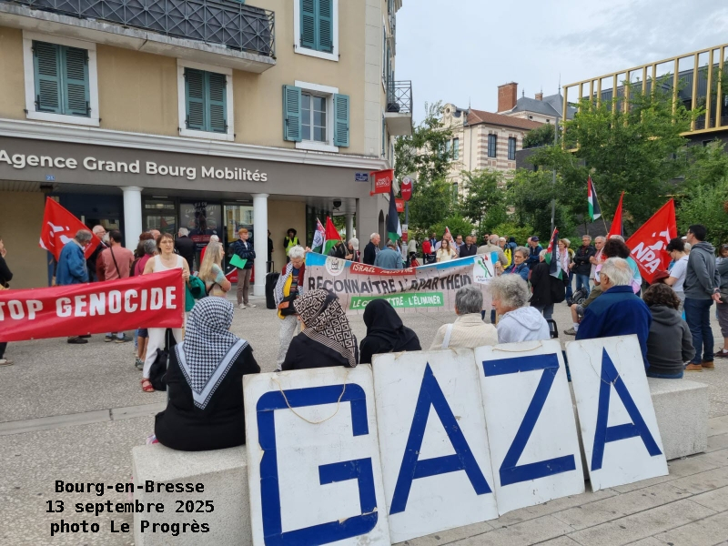 Samedi 20 septembre 10h30 Bourg-en-Bresse – rue du 19 mars 1962 (près de Rubis) Soutien au peuple palestinien. Rassemblement suivie d’une manifestation