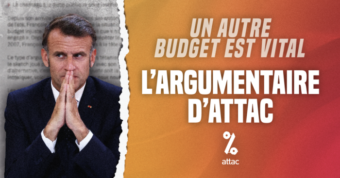 . 12/09 Un autre budget est vital : l’argumentaire d’Attac (Attac France, Un autre budget est vital !) . 8/09 Bye bye Bayrou, maintenant balayons l’austérité ! (Attac France, Communiqués) . 8/09 Appel : Climat, Justice, Libertés ! Marches des résistances le 28 septembre 2025 (Attac France, Le flux) . 6/09 Matériels pour les mobilisations des 8, 10 et 18 septembre (Attac France, Un autre budget est vital !) . 4/09 Les 8, 10 et 18 septembre, mobilisons-nous pour la justice sociale ! (Attac France, Communiqués) . 8/08 Toujours contre la loi Duplomb, pour un autre modèle agricole et démocratique (Attac France, Collectif, Le flux) . 4/08 4 août 1789 – 4 août 2025 : abolissons les privilèges ! (Attac France, Superprofits, ultra-riches, méga-injustices) . 30/07 Indignés par la famine et le génocide à Gaza, Manifestons notre solidarité au cœur de l’été ! (CNPJDPI, Collectif, Solidarité avec la Palestine) . 28/07 Avis historique de la Cour internationale de justice : une avancée majeure pour la justice climatique et les peuples ! (Attac France, Le flux)