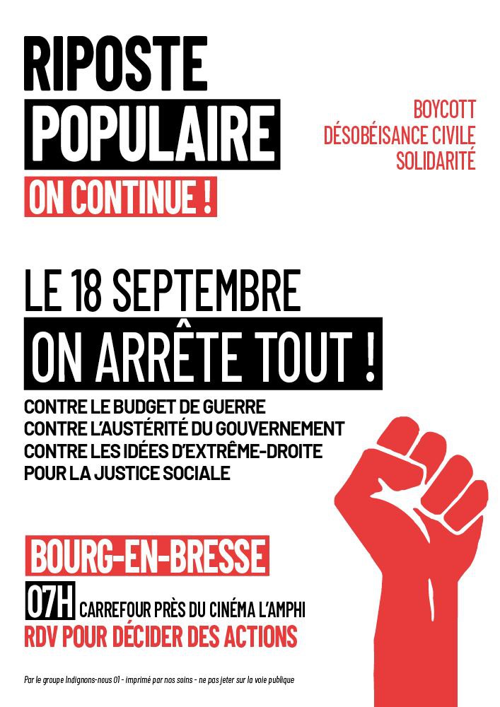Bourg-en-Bresse Mardi 16 septembre de 7h à 9h RV Carrefour de l’Europe (parking LIDL) pour distribution de tracts Jeudi 18 septembre 7h RV Champ de foire /Amphi pour décider d’une action locale Jeudi 18 septembre 12h00-14h00, rassemblement festif et revendicatif devant la préfecture. Prises de parole, entrevue avec la préfète et barbecue. A l’appel de l’ensemble des organisations syndicales. Jeudi 18 septembre 14h Départ en manif