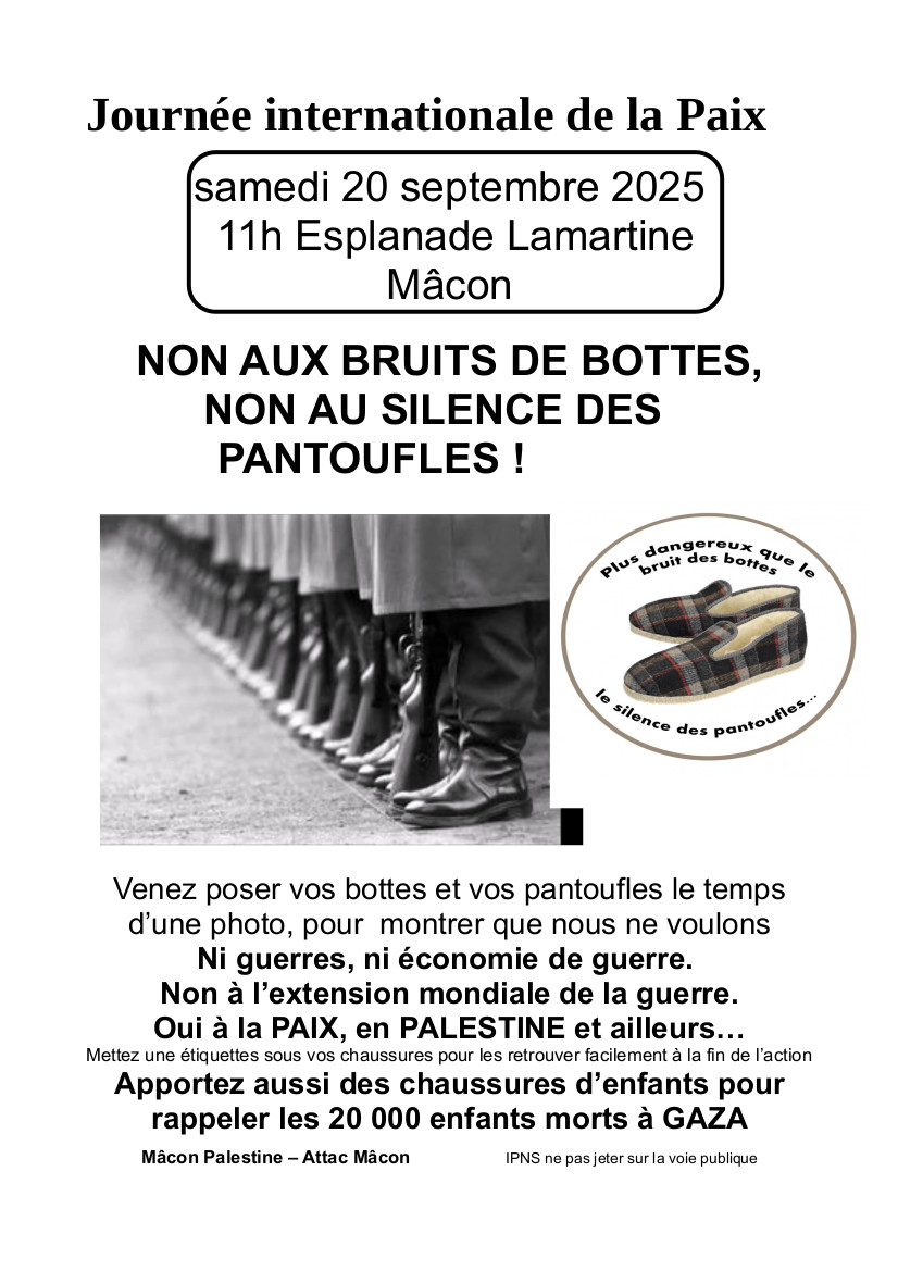 Samedi 20 septembre 11h Mâcon Esplanade Lamartine. NON AUX BRUITS DE BOTTES, NON AU SILENCE DES PANTOUFLES ! Action commune Journée de la Paix / Soutien au peuple palestinien, proposée par Action Palestine et Attac Macon Voir l’affiche-Annonce |