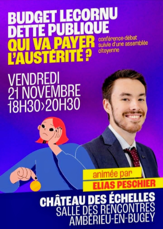 Vendredi 21 novembre 18h30-20h30 Ambérieu-en-Bugey, salle Rencontres du Château des Échelles. Budget Lecornu, Dette publique Qui va payer l’austérité ? Conférence-débat d’ Elias Peschier suivie d’une Assemblée Citoyenne L ’affiche-Annonce Samedi 22 novembre 14h Bourg-en-Bresse départ rue des Blanchisseries Marche contre les violences sexistes et sexuelles