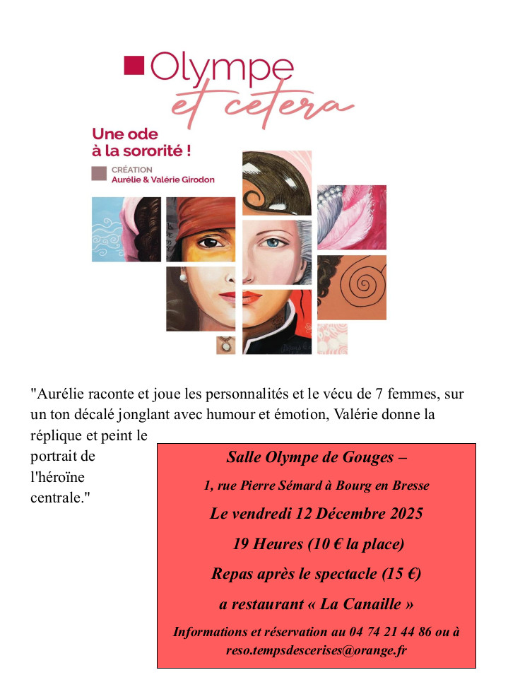 Vendredi 12 décembre 19h Bourg-en-Bresse, salle Olympe de Gouges, 1 rue Pierre Sémard. Olympe et Cetera, une ode à la sororité. Création théâtrale de Aurélie et Valérie GIRODON. Possibilité de repas après le spectacle. Tel 04 74 21 44 86 Voir l ’affiche-Annonce