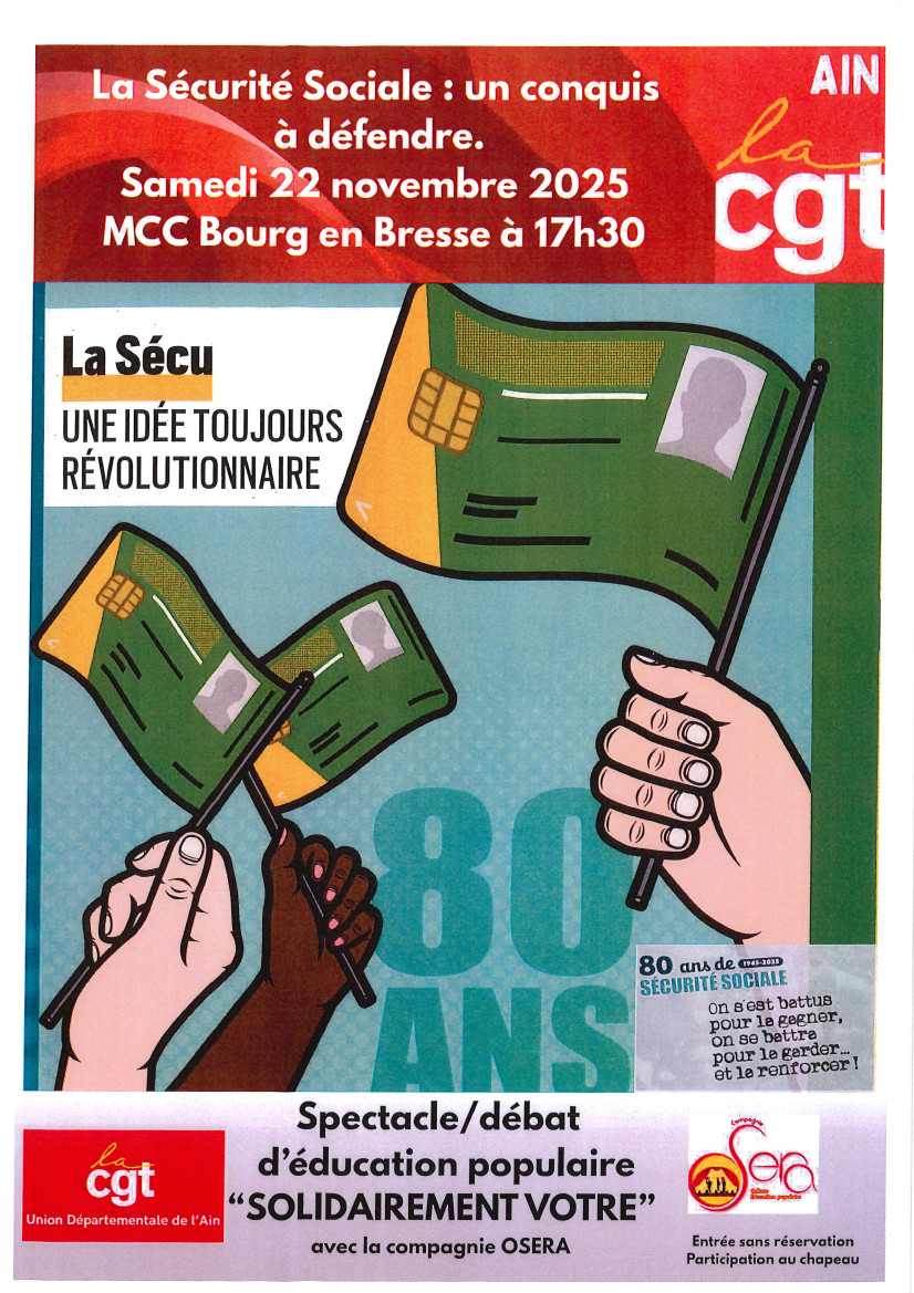 Samedi 22 novembre 17h30 Bourg-en-Bresse MCC Spectacle-débat « Solidairement Votre » de la compagnie OSERA. Spectacle proposé par la CGT pour les 80 ans de la Sécurité Sociale. Dans le cadre de Festisol. L’affiche-Annonce Dimanche 23 novembre 12h Saint-Rémy (Ain) salle des Fêtes Repas solidaire palestinien. Organisé par l'AFPS01. Réservation obligatoire Plus d’infos