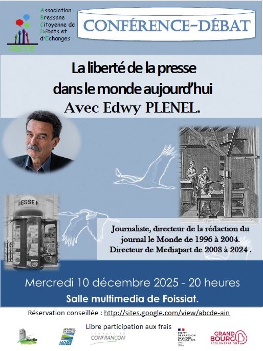 Mercredi 10 décembre 2025 20h Foissiat (Ain) salle multimédia La liberté de la presse dans le monde aujourd’hui Conférence d’Edwy PLENEL, journaliste co-fondateur de Médiapart.