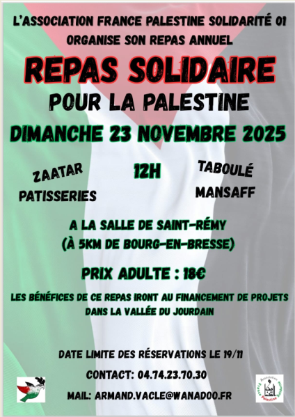 Le collectif Palestine organise un car : Renseignements et inscriptions : afps.01@laposte.net ou 06 79 62 29 61 (préciser Nom, Prénom, téléphone, adresse mail) avant le 15 novembre. Plus d’infos...