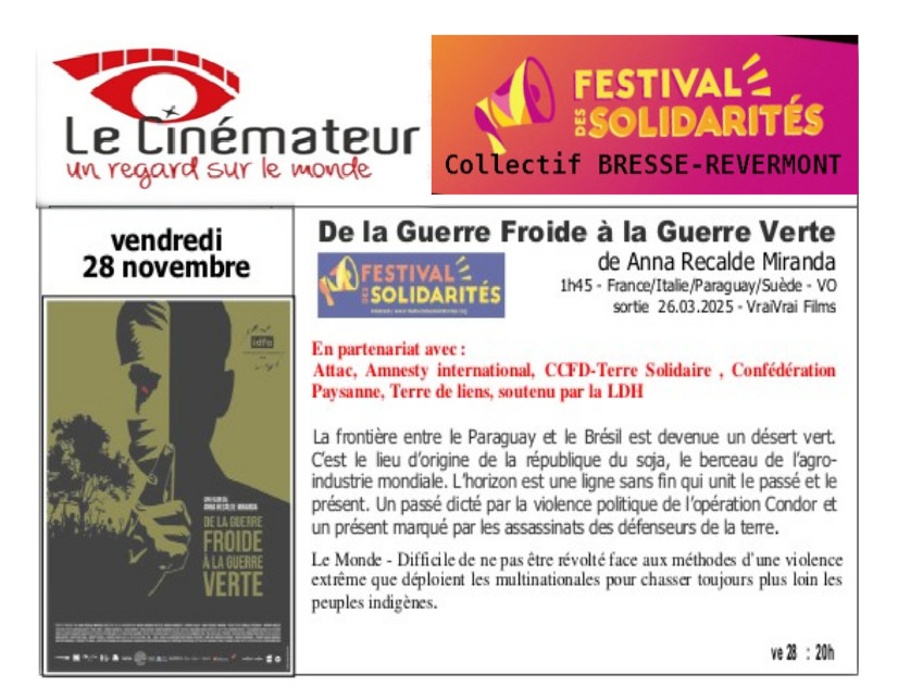 Vendredi 28 novembre 20h Bourg-en-Bresse Cinéma La Grenette. Dans le cadre de FESTISOL, projection-débat du film De la guerre froide à la guerre verte. Soirée animée par Attac avec Amnesty, le CCFD-Terre Solidaire, la Confédération Paysanne, Terre de liens en partenariat avec le Cinémateur et soutenu par la LDH. L’affiche-Annonce Téléchargez le fichier pdf 2xA5 lundi 1 décembre 18h Bourg-en-Bresse, salle du restaurant La Canaille, 1 rue Pierre Sémard.
