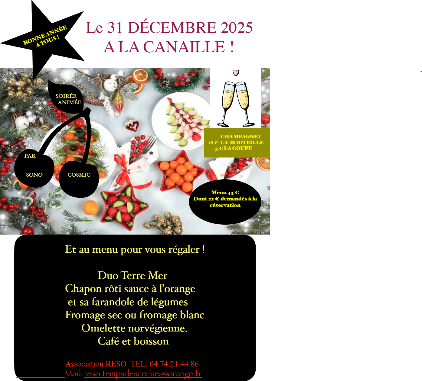 RESO (Réseau Échanges Solidarité) L’association RESO gère l’assemblage d’une pension de famille ou hôtel social, d’un restaurant de quartier, et d’une salle de spectacle et de résidence de groupes artistiques et/ou associatifs. Autrefois, on aurait dit Maison du Peuple, aujourd’hui pour reprendre un mot à la mode, c’est un tiers-lieu. Le restaurant La CANAILLE, Tel 04 74 21 44 86 Ouvert le midi du lundi au vendredi. Menu à 14€ RESO vous propose deux évènements : Vendredi 12 décembre 19h Bourg-en-Bresse, salle Olympe de Gouges, 1 rue Pierre Sémard. Olympe et Cetera, une ode à la sororité. Création théâtrale de Aurélie et Valérie GIRODON. Possibilité de repas après le spectacle. Tel 04 74 21 44 86 Voir l ’affiche-Annonce Mercredi 31 décembre Réveillon du nouvel An à la Canaille. En savoir plus