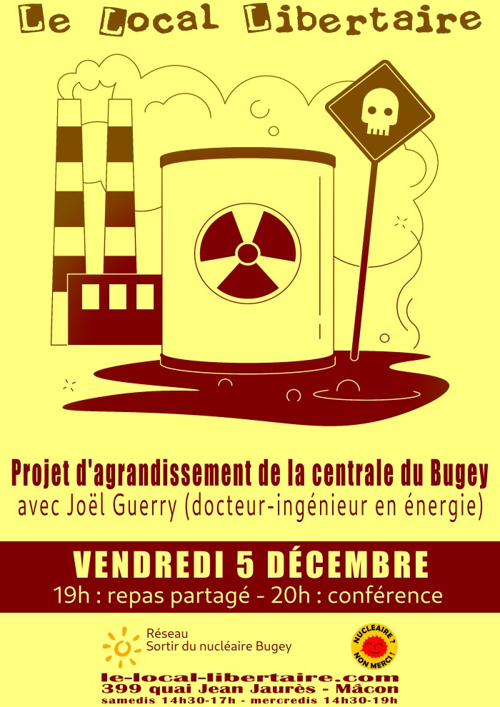 Sortir Du Nucléaire Bugey (STOP-Bugey) Vendredi 5 décembre 20h Mâcon local libertaire 399 quai Jean Jaurès Conférence Projet d’agrandissement de la centrale du Bugey par Joël GUERRY proposé par SDN Bugey L’affiche-Annonce