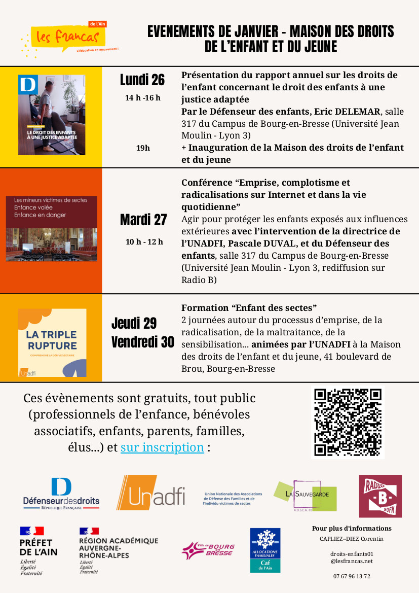 Lundi 26, mardi 27, jeudi 29 et vendredi 30 janvier 2026 Bourg-en-Bresse Trois évènements proposés par la Maison des Droits de l’Enfant. Évènements gratuits, tout public (professionnels de l’enfance, bénévoles associatifs, enfants, parents, familles, élus...) Attention sur inscription Le programme complet