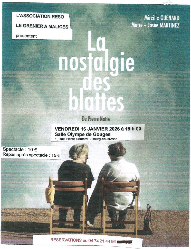 Vendredi 16 janvier 2026 19h Bourg-en-Bresse salle Olympe de Gouges, 1 rue Pierre Sémard. La nostalgie des Blattes de Pierre Notte avec Mireille Guénard et Marie-José Martinez.