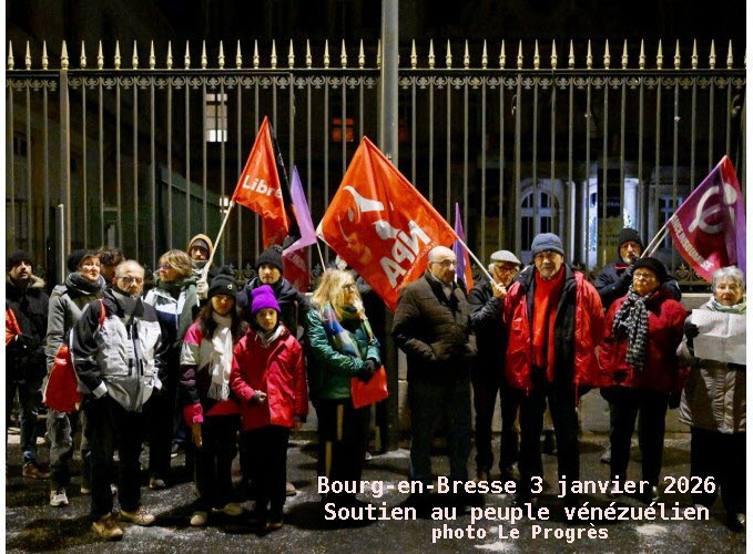 | | | Le samedi 3 janvier, dans l'urgence, à l'initiative d'organisations politiques et d'associations (LFI, NPA, Libre Pensée, ATTAC, UCL, des citoyens se sont rassemblés devant la préfecture pour dénoncer l'agression militaire des Etats-Unis contre le Vénézuela, le kidnapping du président vénézuelien et apporter son soutien au peuple vénézuelien |