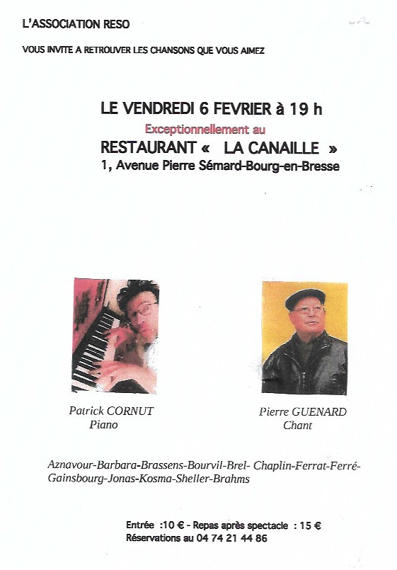 Vendredi 6 février 19h Bourg-en-Bresse restaurant La Canaille, 1 rue Pierre Sémard. Les chansons que vous aimez. Récital Patrick Cornut piano Pierre Guénard Chant. Comme d’habitude Possibilité de repas. Réservation au 04 74 21 44 86 L’affiche-Annonce