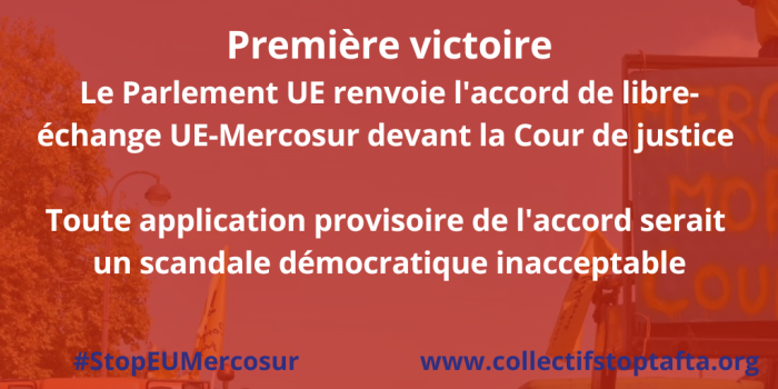 Ce mercredi 21 janvier, le Parlement européen a voté une résolution qui renvoie l’accord de libre-échange UE-Mercosur devant la Cour de justice de l’Union européenne (CJUE). Le processus de ratification européen est suspendu. Ce vote est le fruit des mobilisations paysannes et citoyennes. Réactions des membres du collectif national Stop-Mercosur. Le Collectif national Stop Mercosur et les organisations qui le composent s’en félicitent. Ce vote, qui n’est pas une surprise, illustre ce que nous disons depuis des mois : il n’y a pas de majorité acquise au sein de l’UE en faveur de l’accord le plus nocif jamais négocié par l’Union européenne. Toute application provisoire de l’accord serait un scandale démocratique inacceptable, bafouant le parlementarisme et les institutions européennes. Nous appelons les institutions européennes à revoir leur copie : renforcer les liens politiques, géopolitiques et de coopération avec les pays d’Amérique du Sud, et tout particulièrement avec le Brésil, ne se fait pas en exportant des voitures thermiques et en important des carcasses de viandes réfrigérées. |