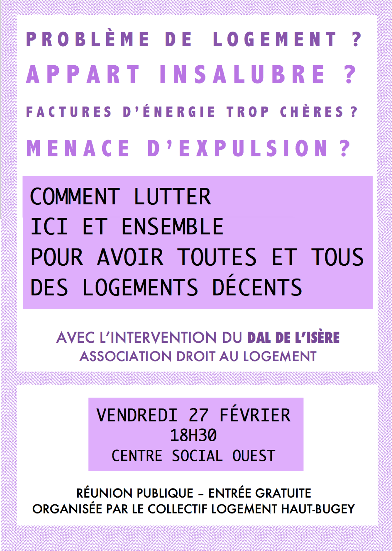 | Vendredi 27 février 18h30 OYONNAX centre social Ouest Problème de logement, appart insalubre, menace d’expulsion.. Comment lutter ici et ensemble pour avoir des logements décents . Réunion publique avec le DAL de l’Isère Association droit au logement (organisée par le collectif Logement Haut-Bugey) Voir l’Affiche-Annonce.. |