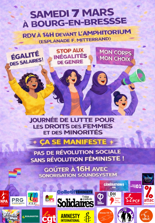 Samedi 7 mars matin Amberieu-en-Bugey Rond-Point de l’Aviation Information de SDN Bugey. En préparation et à confirmer. Samedi 7 mars 14h30 Bourg-en-Bresse Journée de LUTTES pour les Droits des Femmes et des Minorités. Manifestation départ Amphitorium esplanade François Mitterrand L’ affiche-Annonce et le flyer à reproduire et à transmettre à vos connaissances vendredi 13 mars 18h Bourg-en-Bresse salle Olympe de Gouges 1 rue Pierre Sémard. Sorcières processionnaires. Un hymne aux sorcières et à toutes les femmes leurs héritières. L’ affiche-Annonce. Dans le cadre de la journée internationale des droits des femmes