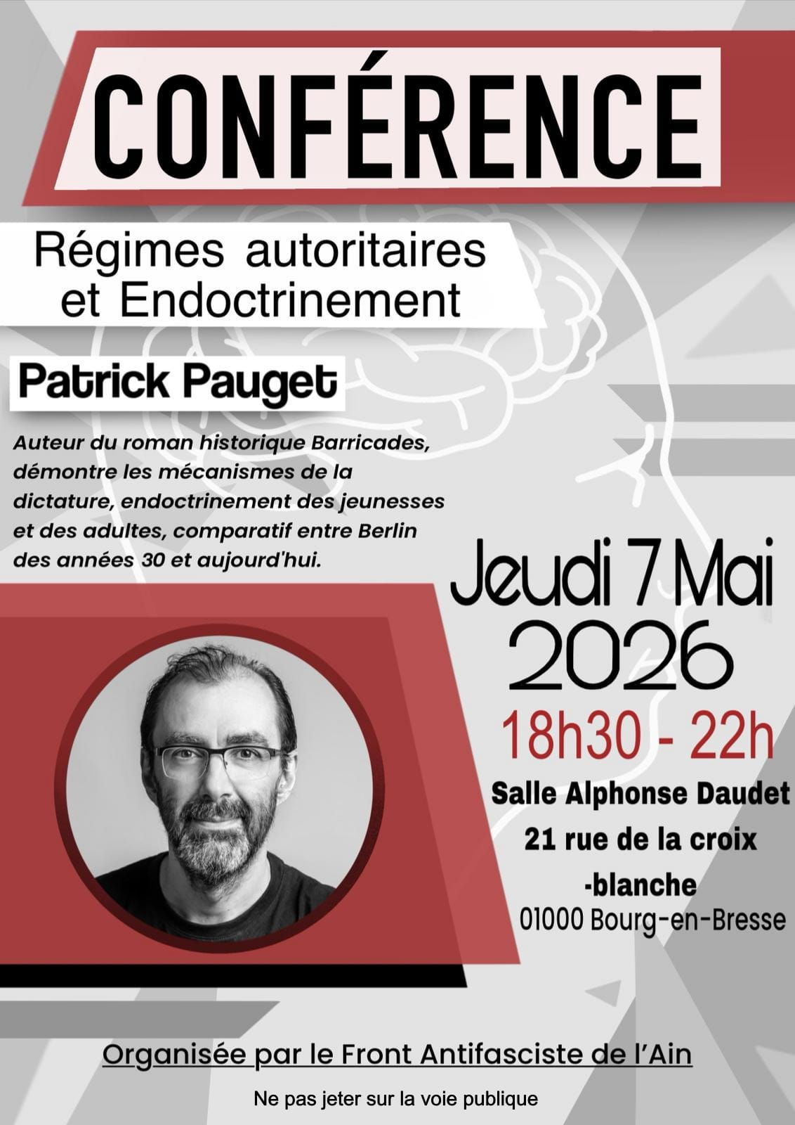 Jeudi 7 mai 18h Bourg-en-Bresse salle Daudet, rue de la Croix Blanche. Conférence de Patrick Pauget Romancier, essayiste à partir de son livre Barricades : Régimes autoritaires et Endoctrinement. A l’invitation du Front Antifasciste de l'Ain…
