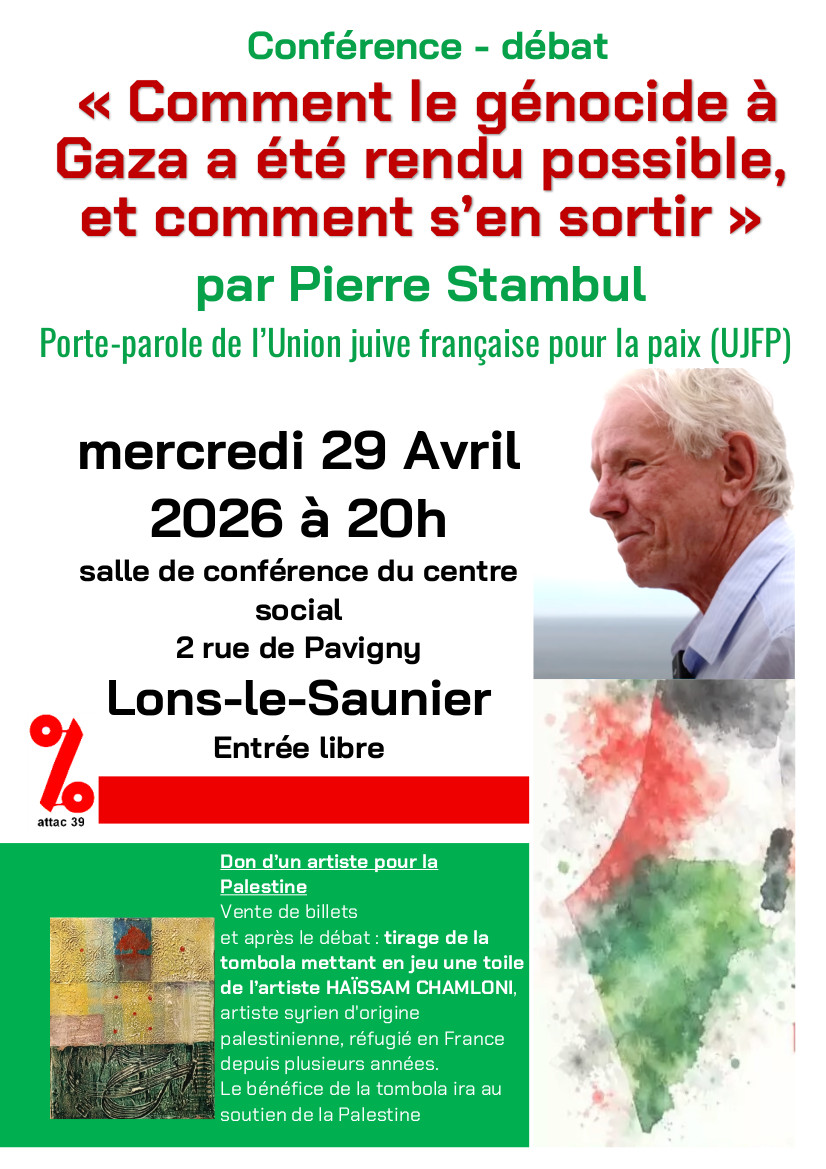 Mercredi 29 avril 20h Lons le Saunier Centre social, 2 rue de Pavigny. Pierre Stambul : Comment le génocide de GAZA a été rendu possible et comment s’en sortir.